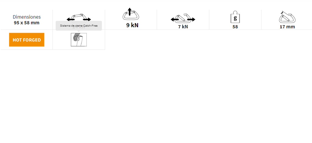 • Cierre catch-free e ingreso estilizado que facilita en enganche/desenganche en anclajes, material y cuerdas.