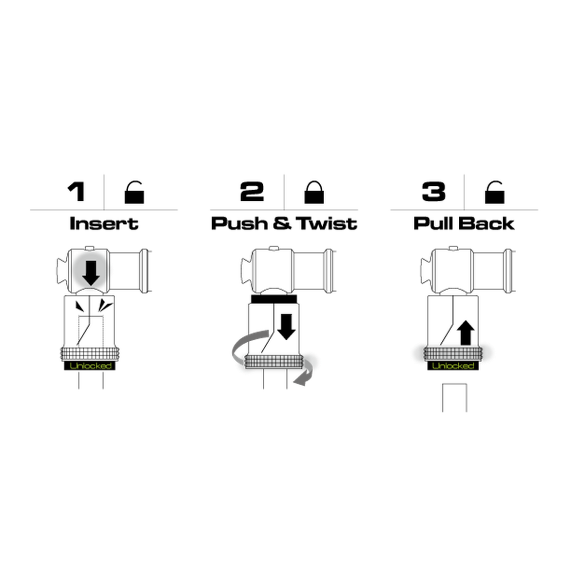 Inserte, EMPUJE el collar hacia abajo y GÍRELO una vuelta para asegurar el enganche; simplemente tire del collar hacia atrás para desengancharlo.