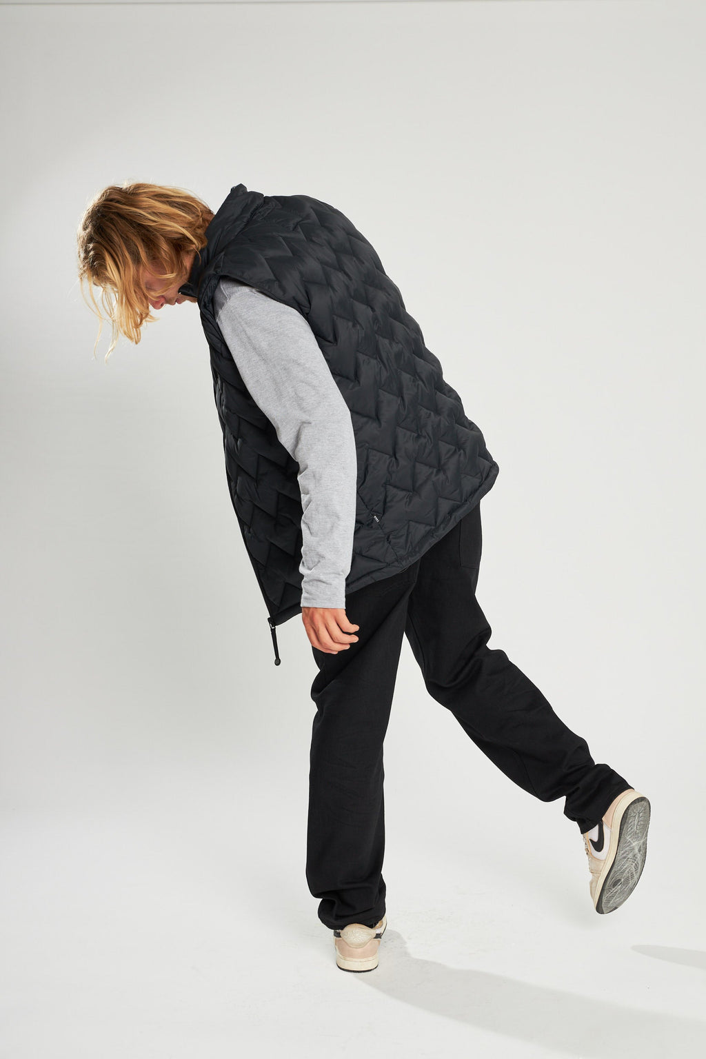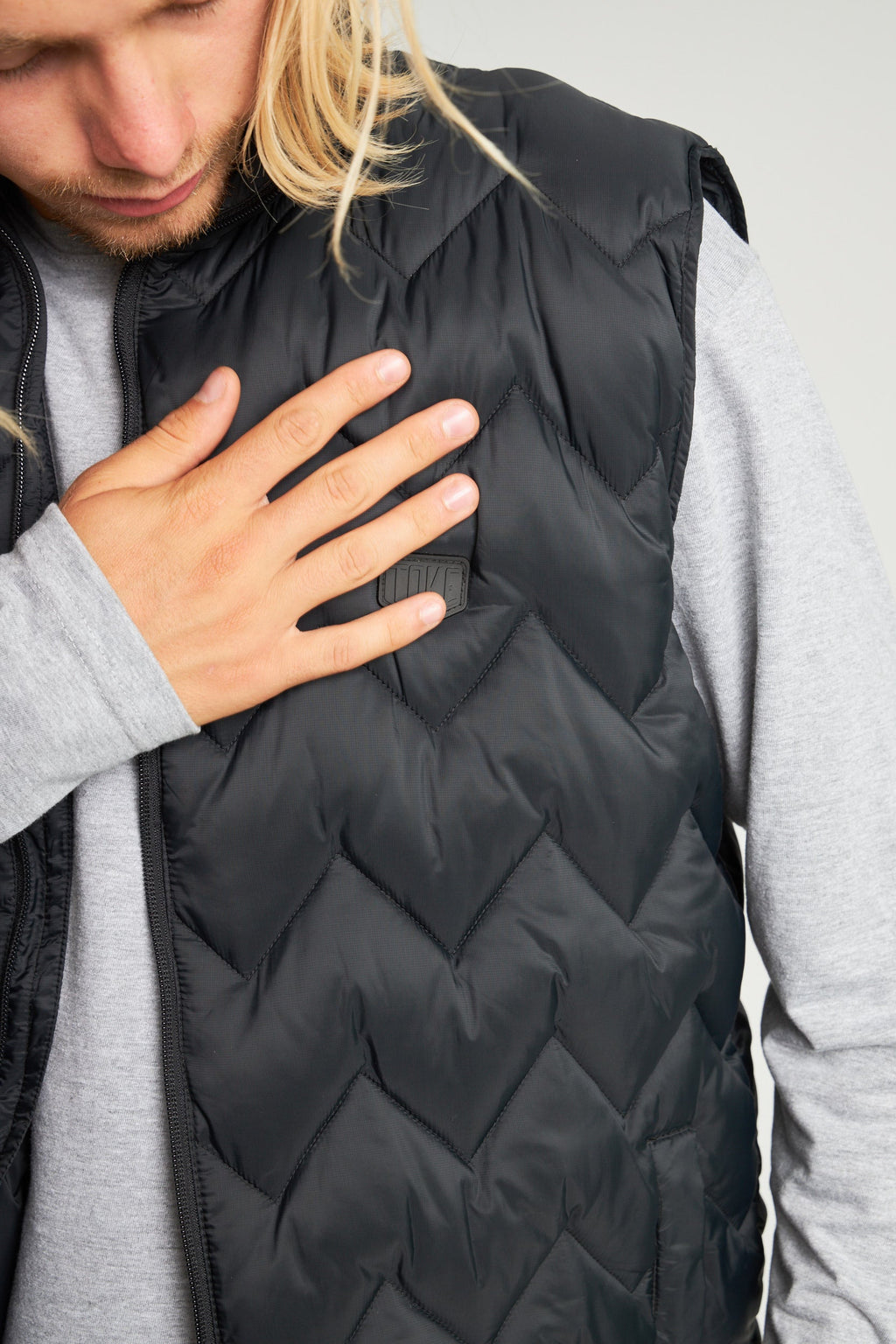Una parka sin mangas de hombre diseñada para ofrecer abrigo sin perder libertad de movimiento. Nuestra Vest Floater Negra es la opción ideal para quienes buscan una chaqueta funcional y estilosa para los días fríos. Su torso con relleno liviano y el patrón zig-zag le dan un carácter único, mientras que su confección en 100% nylon reciclado a base de botellas PET refuerza su compromiso con la sustentabilidad.