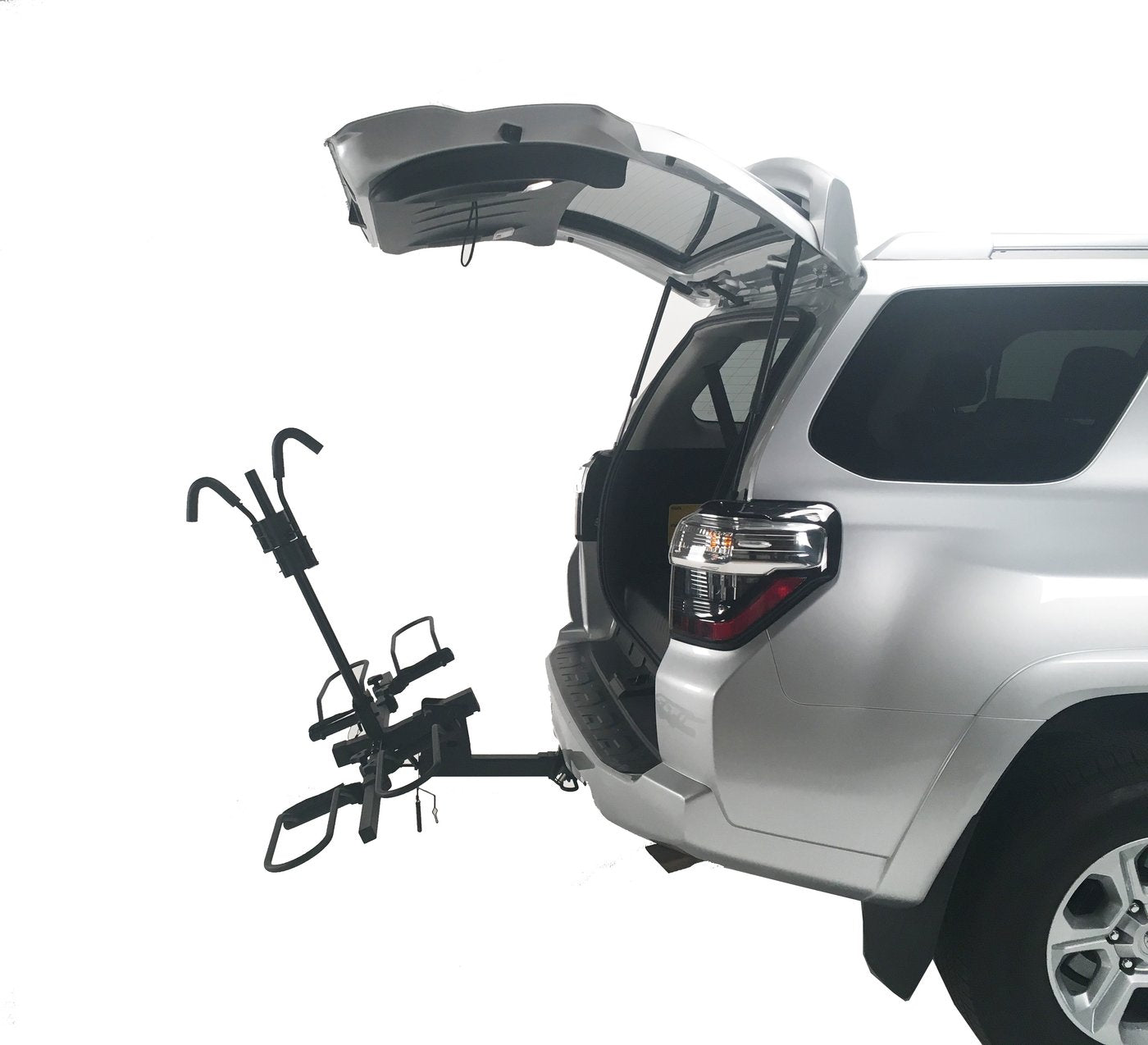 El Portabicicletas se pliega cuando no está en uso, se inclina hacia abajo para facilitar el acceso a la maleta e incluye un pasador de enganche y un cable de seguridad con llave.