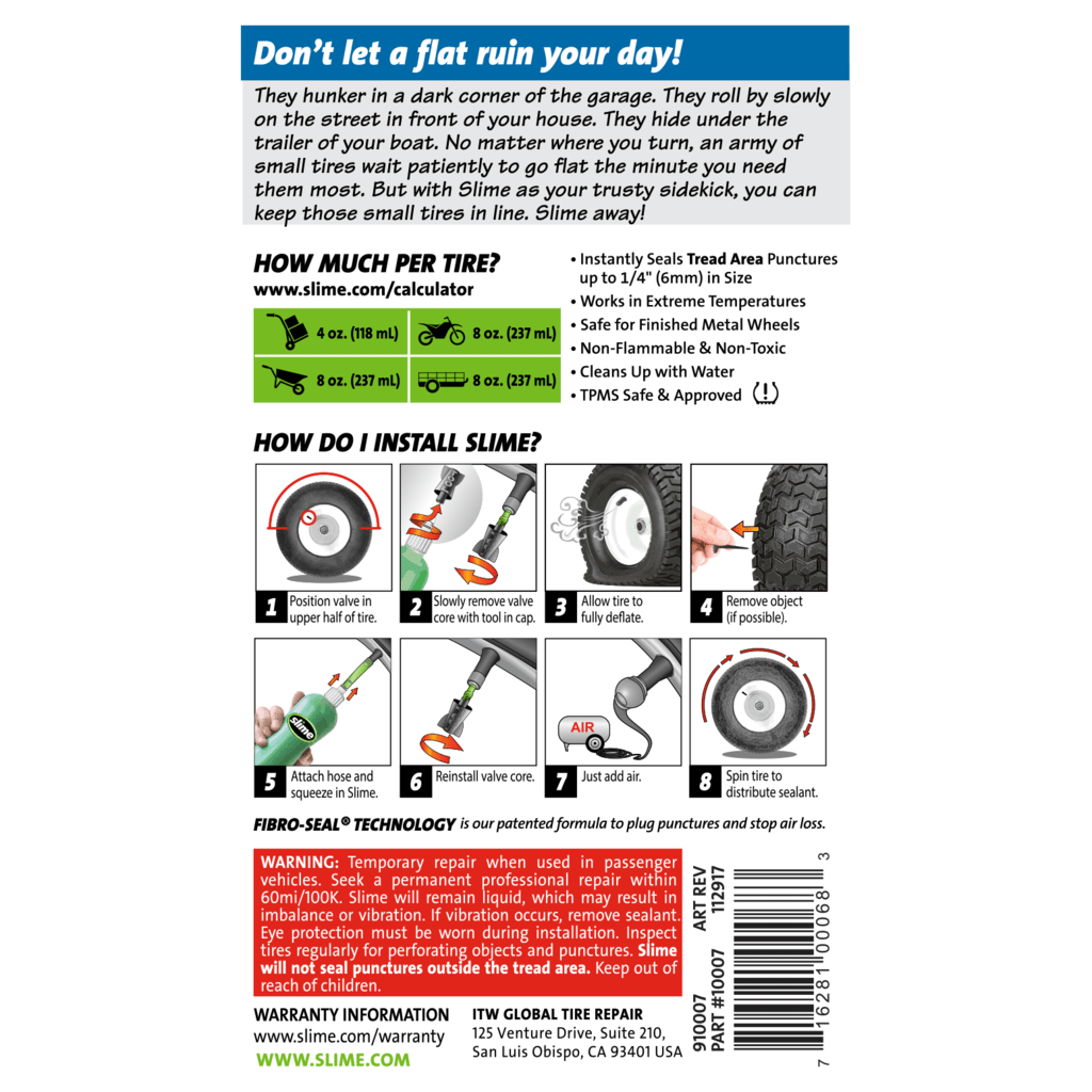 El sellador de llantas Prevent & Repair de Slime busca y sella instantáneamente los pinchazos en el área de la banda de rodamiento en neumáticos sin cámara de hasta 1/4 "(6 mm). Cuando se produce un pinchazo, nuestro sellador patentado se lleva directamente a la fuente. La presión del aire que escapa fuerza la partículas en la abertura, donde se acumulan y se entrelazan para formar un tapón flexible y duradero.