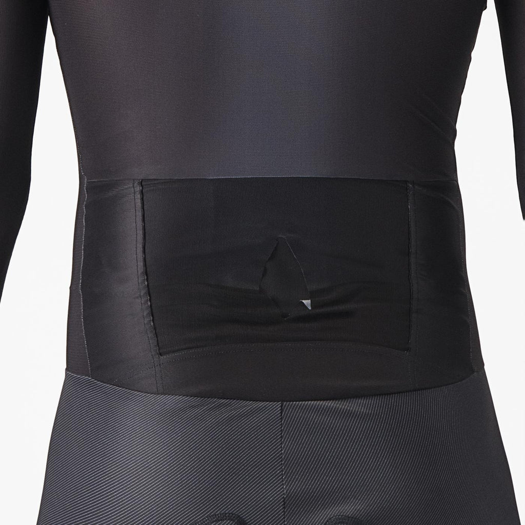 SE LO AGRADECERÁS A LA UCI (Unión Ciclista Internacional) Si pudiéramos mantendríamos este traje como un secreto industrial, lo cual supondría una ventaja competitiva para nuestros ciclistas profesionales. Pero las normas de la UCI nos obligan a comercializarlo para mantener en igualdad de condiciones a todos los equipos. Así que aquí lo tenéis. No queremos desvelar todos los detalles secretos que lo convierten en un traje tan rápido, pero algunos de ellos los puedes identificar tú mismo: ajuste increíble en la posición TT, tejidos por los que se desliza el agua, costuras reducidas y perneras largas con terminaciones y banda de agarre planas para mantenerlas en su sitio. La manga larga presenta una abertura para el pulgar que evita que se deslice hacia arriba. Presenta un bolsillo con ventana en la espalda para colocar el dorsal de la carrera y protegerlo del viento.