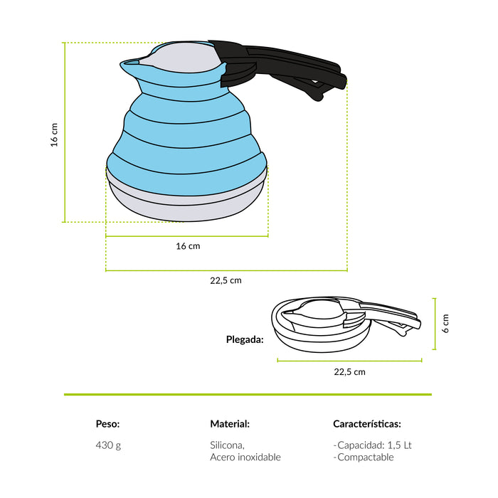 Esta tetera plegable es una opción sumamente útil, cómoda y compacta. Será tu aliada perfecta para maximizar el espacio cuando salgas de camping o realices actividades de trekking. Este elemento esencial de cocina se convertirá en tu compañero inseparable en cada uno de tus paseos. No puede faltar en tu mochila de senderismo o en tu caja de camping. Te aseguro que la vas a extrañar si decides dejarla atrás.
